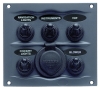 Compact panel size. Includes sprayproof inline fuse holder and fuses. Waterproof power socket rated for 16 amps. Dimensions: 3.75"H x 4.25"W x 2.9"D.
