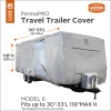 Zippered panels allow complete access to all entrances. Triple-ply PolyPRO 3 keeps out rain and snow. Thick, triple-ply top and single-ply sides protect against rain, snow, dirt, nicks and scratches for all-season protection. An integrated air vent system combined with quick drying Extra strength PermaPRO ripstop fabric repels water and protects against dirt and sun damage. Air vent system and quick drying PermaPRO fabric combine to reduce wind stress and vent inside moisture. Adjustable front and rear tension panels and elasticized hem corners provide a custom fit. Zippered panels allow access to the RV doors and storage compartments. Long zipper pulls reduce the need for a ladder. Integrate strap attachment and weighted toss bag system eliminates crawling under the RV to install the tension straps. Tension panels reduce cover stress when tightening the straps. Zippered storage bag expands for easy packing. 4 Year Warranty. Fits Travel Trailers 30' - 33' length, 118" max height.