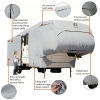 Extra strength, lightweight Permapro ripstop fabric repels water and protects against dirt and sun damage. Air vent system and quick drying Permapro fabric combine to reduce wind stress and vent inside moisture. Adjustable front and rear tension panels and elasticized hem corners provide a custom fit. Zippered panels allow access to the RV doors and storage compartments. Long zipper pulls reduce the need for a ladder. Integrated strap attachment and weighted toss bag system eliminates crawling under the RV to install tension straps. Tension panels reduce cover stress when tightening the straps. Zippered storage bag unzips and expands providing five additional inches of height in storage space. 4 year warranty.