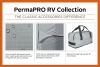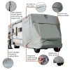 Extra strength, lightweight PermaPro ripstop fabric repels water and protects against dirt and sun damage. Air vent system and quick-drying PermaPro fabric combine to reduce wind stress and vent inside moisture. Adjustable front and rear tension panels and elasticized hem corners provide a custom fit. Zipper panels allow access to the RV doors and storage compartments. Long zipper pulls reduce the need for a ladder. Integrated strap attachment and weighted toss bag system eliminates crawling under the RV to install tension straps. Tension panels reduce cover stress when tightening the straps. Zippered storage bag unzips and expands providing five additional inches of height in storage space. 32'-35', 125" height.