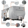 Extra strength, lightweight PermaPro ripstop fabric repels water and protects against dirt and sun damage. Air vent system and quick-drying PermaPro fabric combine to reduce wind stress and vent inside moisture. Adjustable front and rear tension panels and elasticized hem corners provide a custom fit. Zipper panels allow access to the RV doors and storage compartments. Long zipper pulls reduce the need for a ladder. Integrated strap attachment and weighted toss bag system eliminates crawling under the RV to install tension straps. Tension panels reduce cover stress when tightening the straps. Zippered storage bag unzips and expands providing five additional inches of height in storage space.