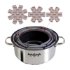 Made of 100% 18-8 mirror polished Stainless Steel, Magma’s Award-Winning 10-Piece Cookware Set is now available with an elegant colored exterior and Non-Stick coating. Set completely nests and store in less than 1/2 cu. ft. of cabinet space and are compatible with all stove types, including induction.. The heavy duty Non-Toxic, PFOA, and PTFE free, Slate Black, non-stick is remarkably easy to clean, will not stain, peel, blister, or flake. The encapsulated Triple-Clad bottoms (Stainless Steel, Aluminum, Stainless Steel) are milled perfectly flat for perfect heat distribution. The Triple-lad bottoms outer layer uses the highest quality ferromagnetic stainless steel, specifically used to activate the magnetic field in all Induction cooking surfaces. Set includes: three Sauce Pans (1-1/2 qt., 2 qt., and 3 qt.), lid that fits all three sauce pans, 5 qt. Stock Pot, 10 in. diameter Skillet/Frying Pan, lid for Stock Pot and Skillet/Fry Pan, (2) ergonomic removable handles, and a convenient bungee storage cord. Cookware is oven safe to 500 degrees F (excludes removable handles).