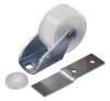 Protects awning from rips and tears made by entry doors. Easily slides into bracket when needed. Heavy duty extra wide plastic roller. Zinc plated to resist rust. Includes screen door protector disc. Mounting area is 1-1/4" long. Bracket is 2-1/2" long