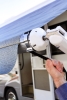 Awning tensioner pulls your awning roller tight, reducing the noise of flapping fabric without stakes or anchors. Easy installation requires no tools and attaches to existing awning hardware. Works on all makes of awnings.