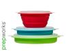 Expand to use and collapse to store. PP and TPE 1.5, 3 and 5 cup capacities. Dishwasher, microwave and freezer safe. Teal, green and red.